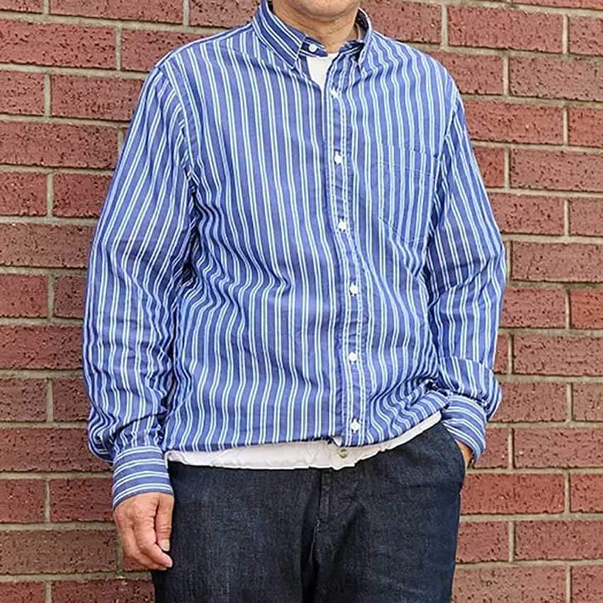 ひと言で表すならば、「品行方正」。ブルーストライプシャツは、ただ羽織るだけで大人の品格を醸し出せる魔法の一着だ。