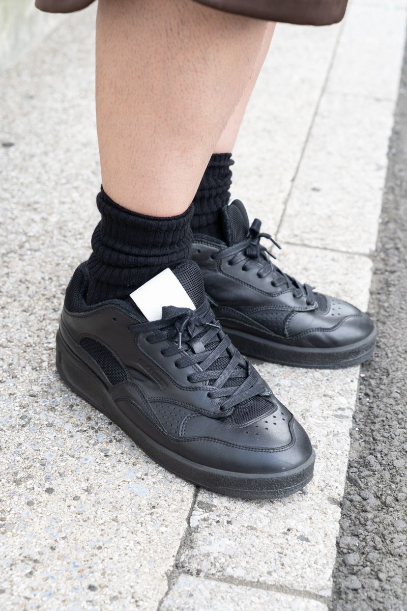 こちらのスニーカーも同様。シックなオールブラックでシュータンに付いた白いタグだけがアクセントとなる一足。ショーツに合わせれば、その恩恵はさらに増す。