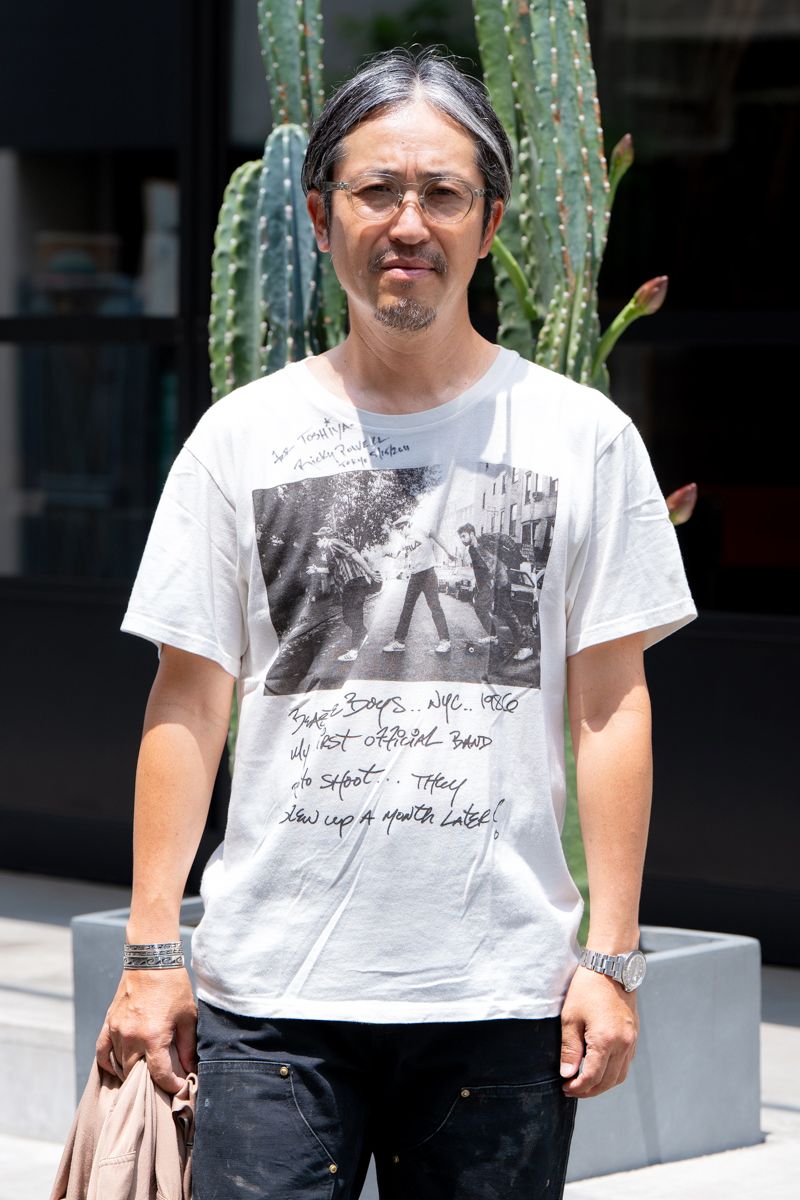 ▶森さんのスナップをすべて見る森 闘士也さん(49歳)開襟シャツは、多めにボタンを開けてもサマになる。欲を言うなら、開いた"Vゾーン"からTシャツのグラフィックを覗かせると、より奥行きが生まれる。森さんはフォトグラファーのサインが入ったビースティ・ボーイズの一着をイン。シャツを着ていても、脱いでも気になる装いだ。