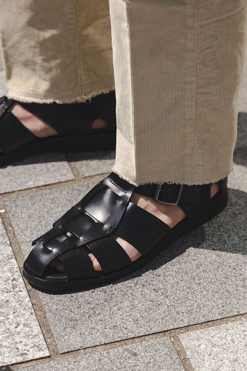▶︎宍戸さんのスナップをすべて見る宍戸 哲さん(38歳)一見シンプルなベージュパンツに見えて、細畝コーデュロイで裾は切りっぱなし風のデザイン。実はひと癖ある一本であれば、足元もシンプルではもったいない。その点、大人らしさと爽やかさを両得するグルカサンダルもひと癖あってちょうどいいバランスでキマる。都会派サンダルとして、これ以上ない選択肢。