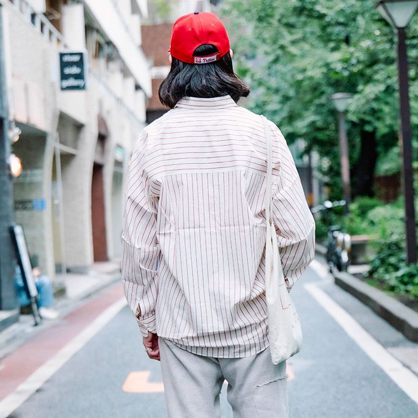 ▶︎Ryokiさんのスナップをすべて見るRyokiさん(27歳)淡いピンクストライプのシャツはどこか可愛げすら感じさせる。そのトーンに合わせるように、デニムはライトグレー、サンダルも同系色で揃え、全身爽やかな色みに。