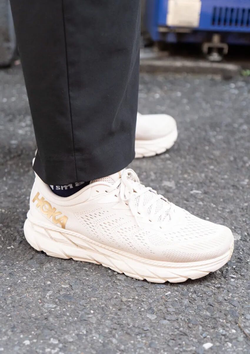 そんなホカの着用者を街角から探してみると、モノトーンコーデで取り入れた姿がちらほらと。あえて色物を使わないからこそ、足元の存在感が際立つ。早速見てもらいたい。