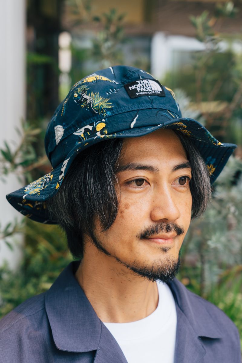 コーデがシンプルゆえ、アクセントに加えたノースのバケットハットの柄もよく映える。