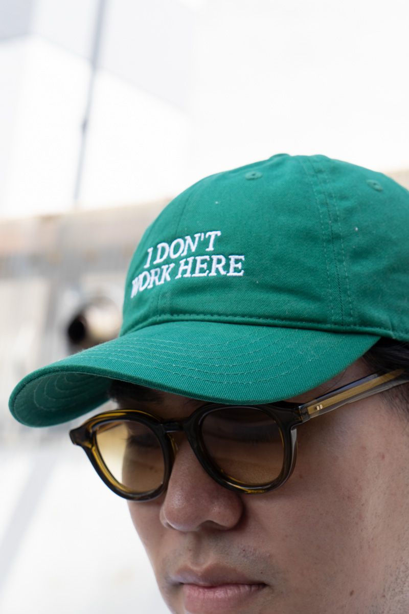 鮮やかなグリーンのキャップ、開放感のある“マルジェラ”のレザーサンダルはリラックスしたムードをさらに加速。無二の「白&黒」スタイルを決定づけた。