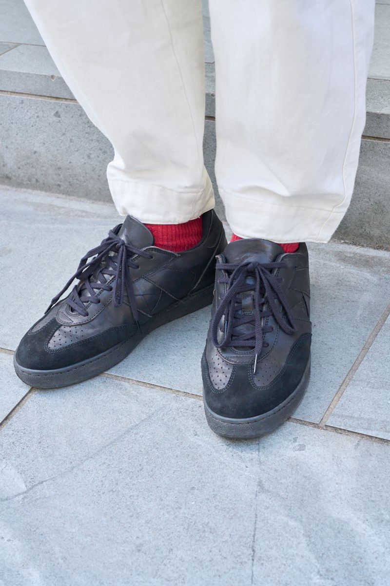 白地のキャンバス上で個性を発揮するのが、シングスザットマターのグラフィックT。ソックスと色を合わせ、さりげなく“赤”をまぶす。間違いなくグッドセンス。