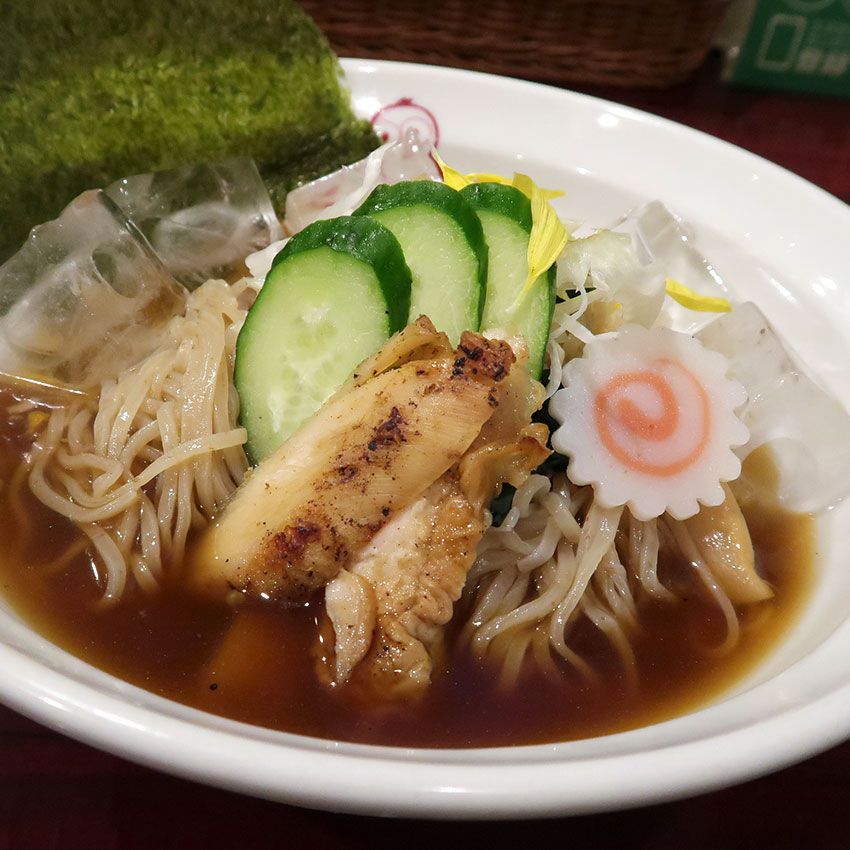 “なまり”といえば「つったいラーメン」の「つったい」は山形の方言で「冷たい」のこと。さらに店名の「ととこ」は「にわとり」のこと。文字どおり、スープの出汁は鶏ガラから旨味を抽出、具には炙られた鶏肉が鎮座しています。