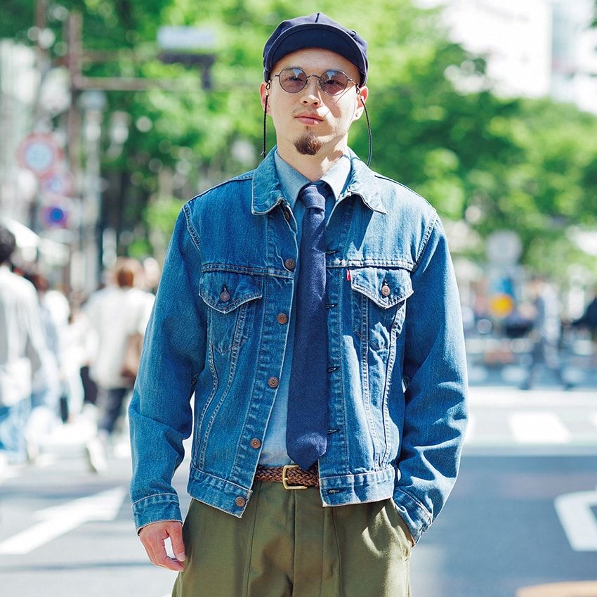 デニムジャケット=リーバイス シャツ、パンツ、キャップ=不明 タイ=エンジニアド ガーメンツ 靴=パラブーツ サングラス=金子眼鏡店