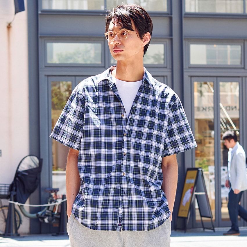 小澤泰成さん / 30歳爽やかなチェックの開襟シャツにスウェットパンツ、そしてクリアフレームのサングラスで、夏の開放感を存分に演出。