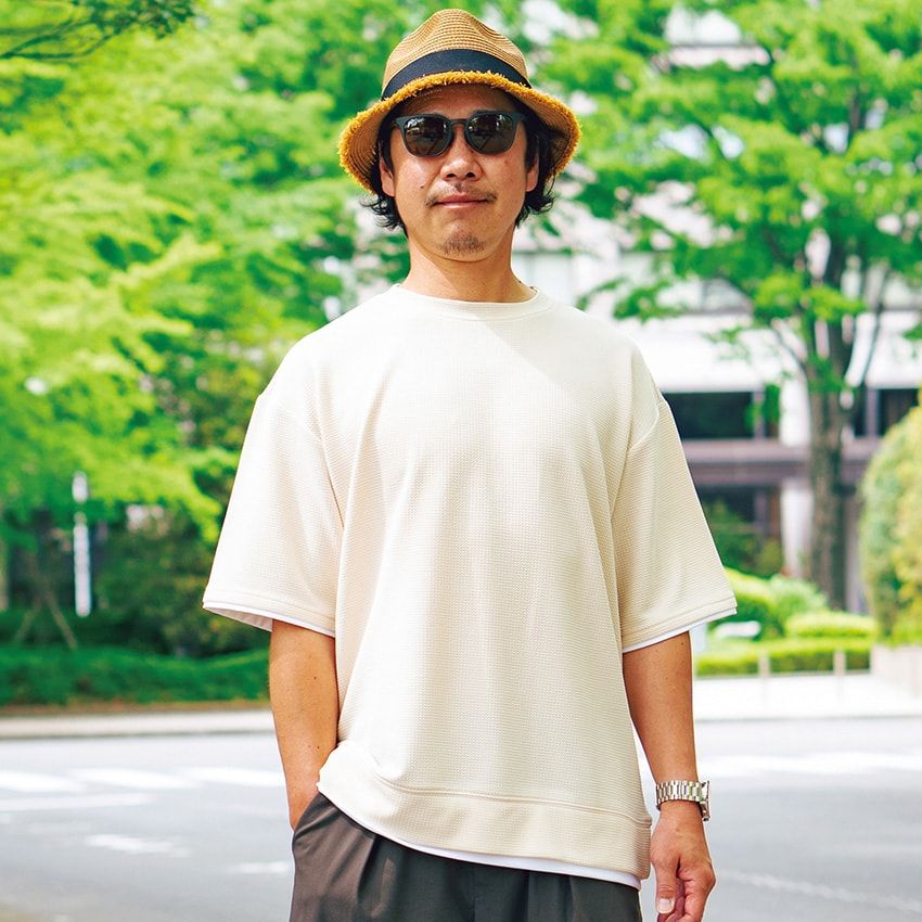 高橋政人さん / 46歳オーバーサイズでモノトーン、そしてブラックサングラス。どれも都会的だ。だが、ストローハットを取り入れるだけで、リゾートライクな、いい感じの季節感が手に入る。