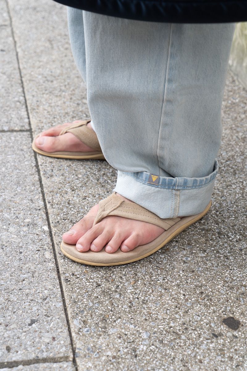 ▶︎田中さんのスナップをすべて見る田中晃平さん (28歳)ブルー×パープルの色みが新鮮なボーダーTに、ブルーデニムを合わせて若々しく。非常に薄いライトブルーをゆったりサイズで、裾は長めにロールアップ。全身青い服だけれど、まったく単調には見えない。サンダルを合わせればレトロかつフレッシュな海カジの出来上がり。