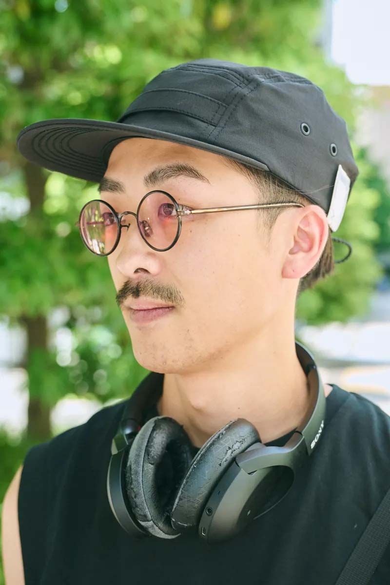 ▶︎小笠原さんのスナップをすべて見る小笠原 大さん(28歳)斜め掛けしたタンブラーホルダーはもちろん、何と言ってもヘッドホンが若々しいアクセントに。Bluetoothイヤホンが主流の今、これ以上ない個性的なアレンジだ。