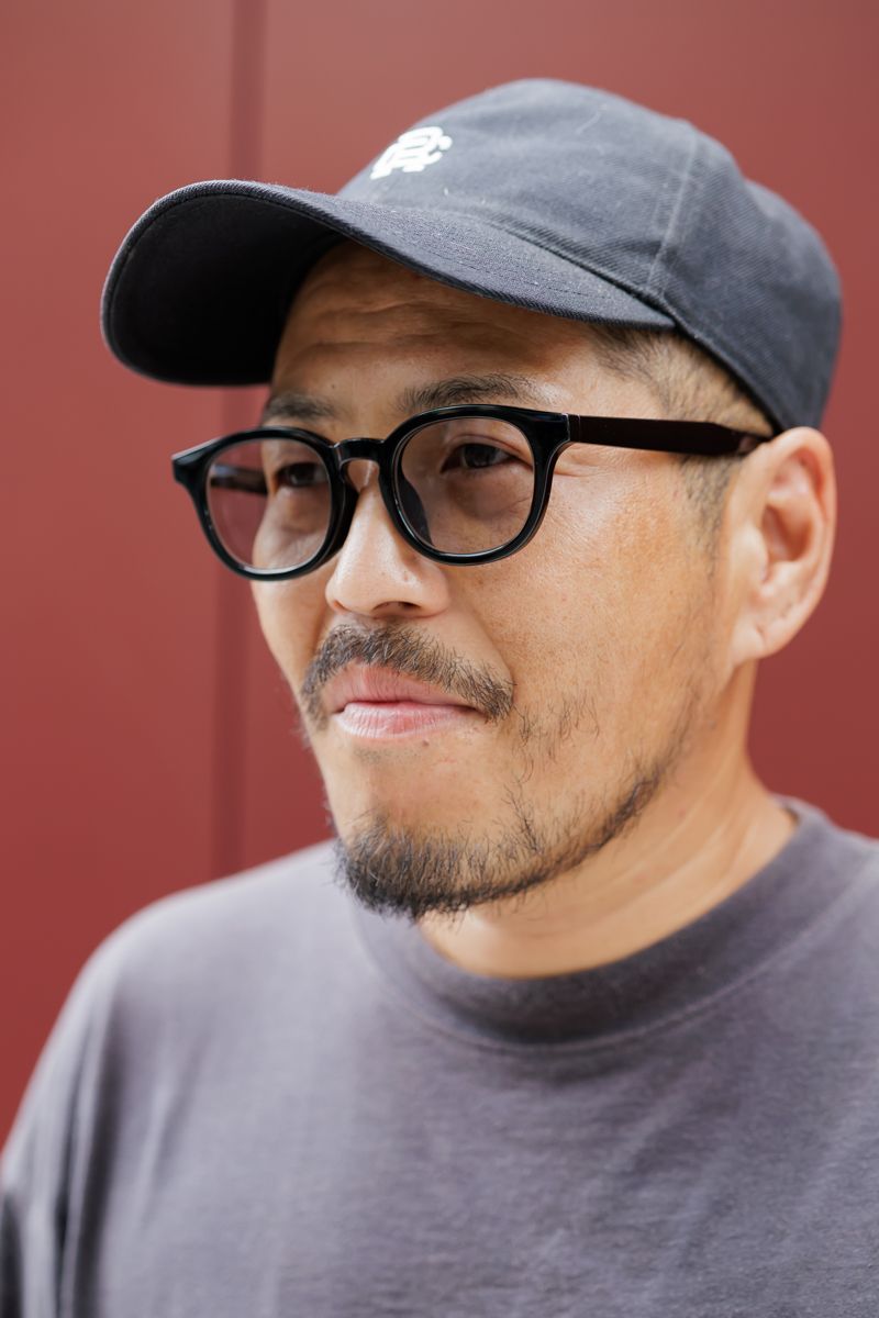 Tシャツ=バレンシアガ パンツ=ザラ シューズ=ウーフォス 帽子=ロンハーマン 眼鏡=ゾフ