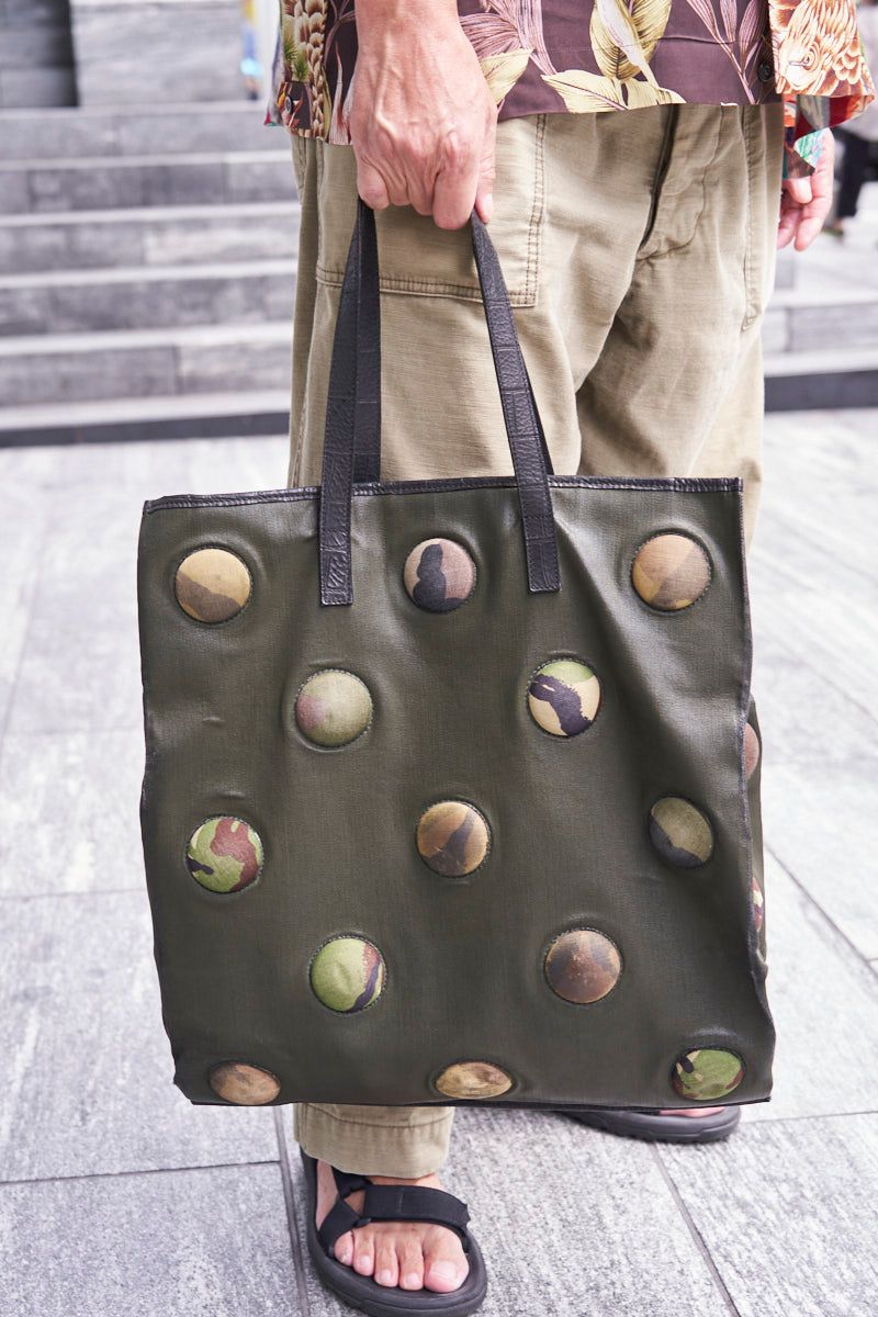 坂本さんは全身の色使いをアロハのトーンに合わせ、ミニマルに装う。茶系ベースのアロハに、ベージュのパンツやオリーブ色のバッグといったアーシーなアイテムを選択。こういう気配りが、こなれたスタイルを作り出すのだ。