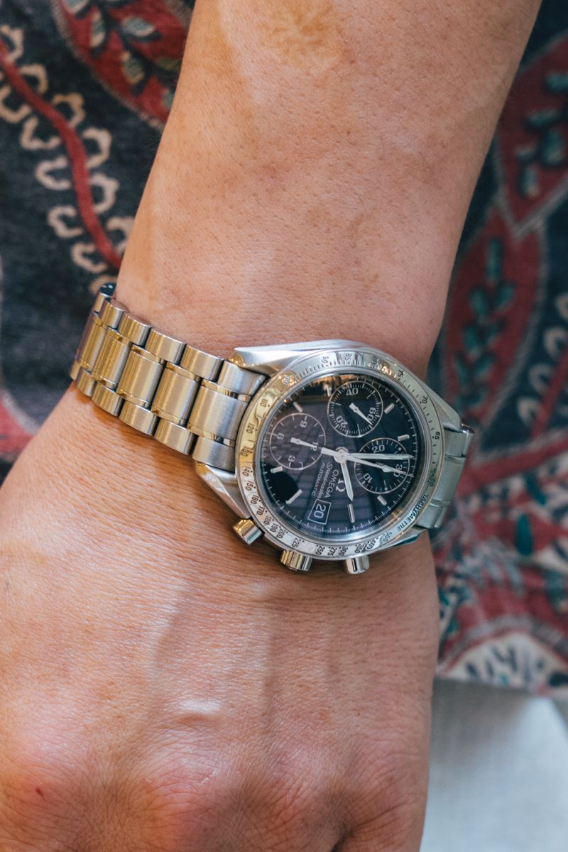 シャツ=ポロ ラルフ ローレン カットソー=ヘインズ パンツ=ギャップ シューズ=トリッペン 眼鏡=金子眼鏡 腕時計=オメガ ブレスレット=ロンワンズ