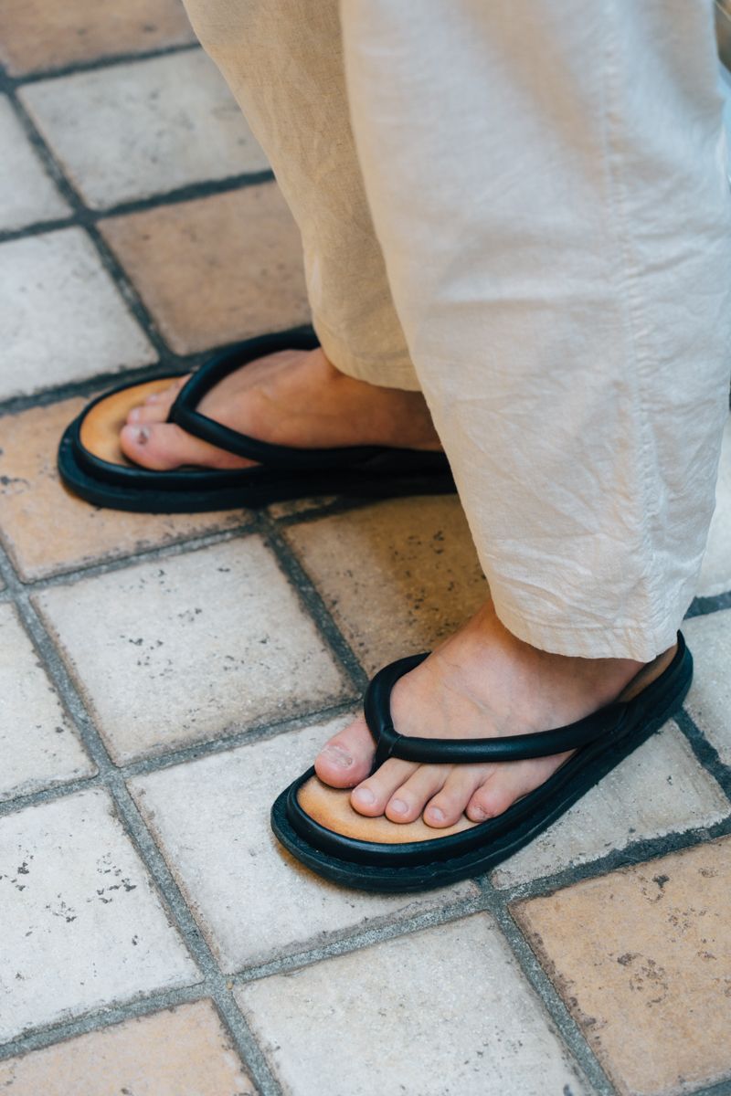 シャツはタックアウトし、パンツは9分丈程度に調整。そして足元は黒サンダルでラフながらシックに。シャツの印象が強い分、これくらいシンプルな方がカッコ良い。