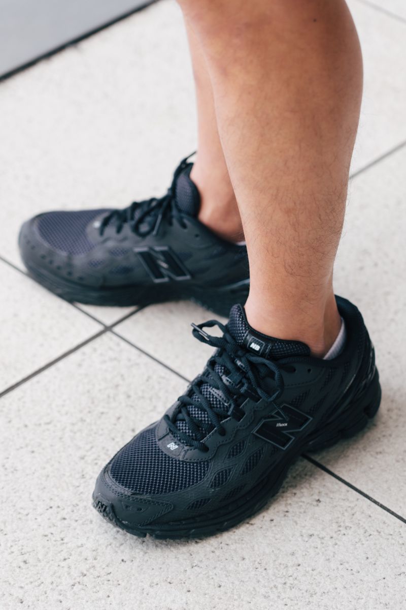 ニューバランスは1906をセレクト。メッシュの軽やかさと黒の重厚感がいい塩梅の一足だ。全体的にシックな色選びの中、グリーンのショルダーバッグがよきスパイスに。