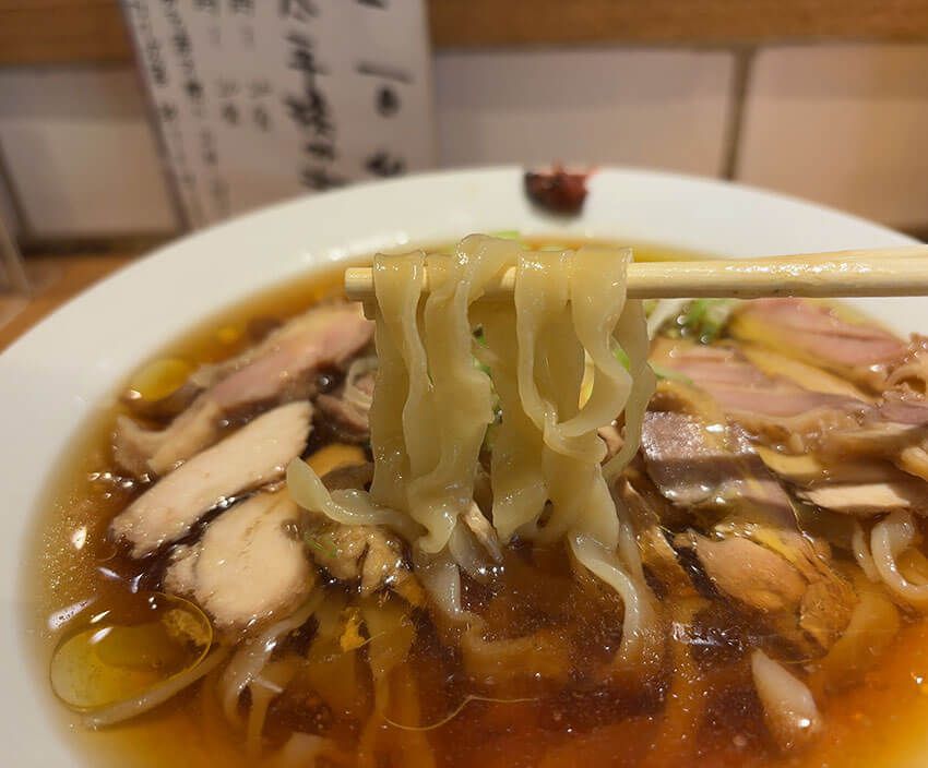 スープはほんのりと甘味を有しつつも後味は軽く、いつまでも飲んでいたくなる感覚。梅肉による酸味が程よい変化をもたらし、食欲増進の効果も十分に発揮しています。平打ちの手揉み麺は、冷えても硬くなりすぎず、もちもち感とぐにっと感が共存。