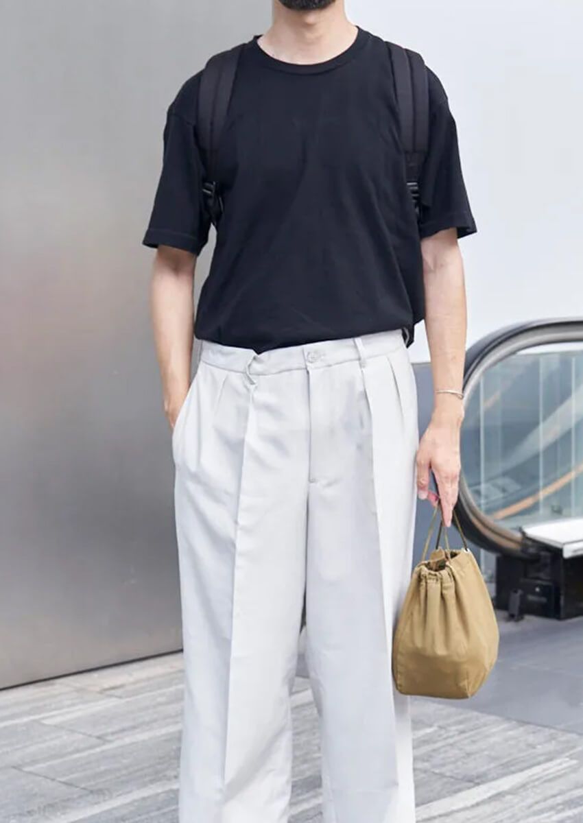 リネン混とおぼしき白シャツに、ゆとりある黒ストライプパンツを合わせた涼しげな装い。素材の透け感、シワ感をあえて味わいと捉えることで、肩の力が抜けた大人の余裕を演出している。
