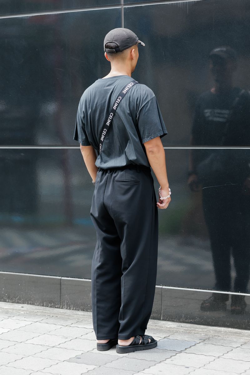 ▶三宅さんのスナップをすべて見る三宅慎也さん(42歳)三宅さんのスタイルには、オールブラックを自分色に変えるテクが満載。アイテムごとに黒の濃度や素材感を変え、ビッグシルエットとタックインでギャップを作った。