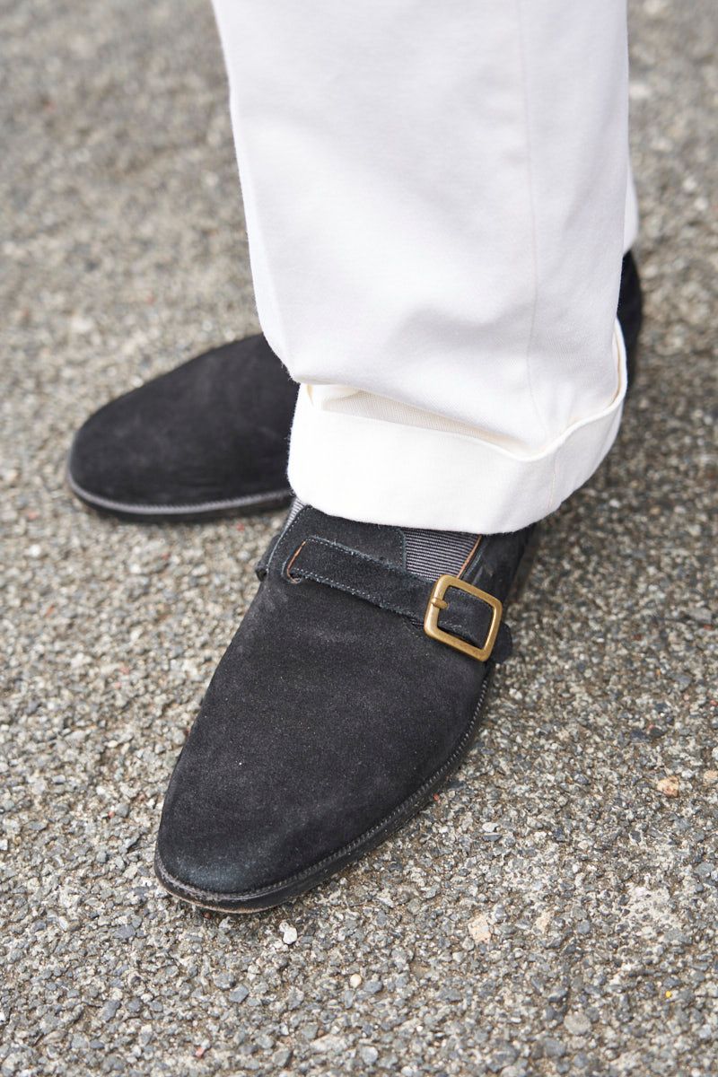 見るからにヨーロッパ的な気品が漂うデニムシャツ、シングルモンクのスエードシューズというチョイスも秀逸。ヒゲを含めた顔周りまで、文句なしに洒落てる。