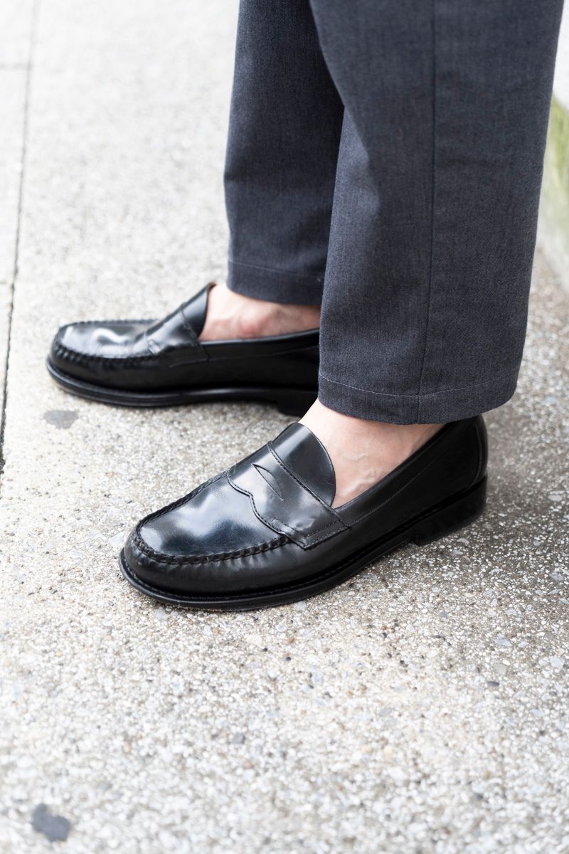 力強さとともに音楽カルチャーを匂わす太縁を目元に据え、腕にはシンプルなスウォッチ、足元には品のいいローファーを起用。カラーはすべて黒でまとめ、より凛とした表情に。