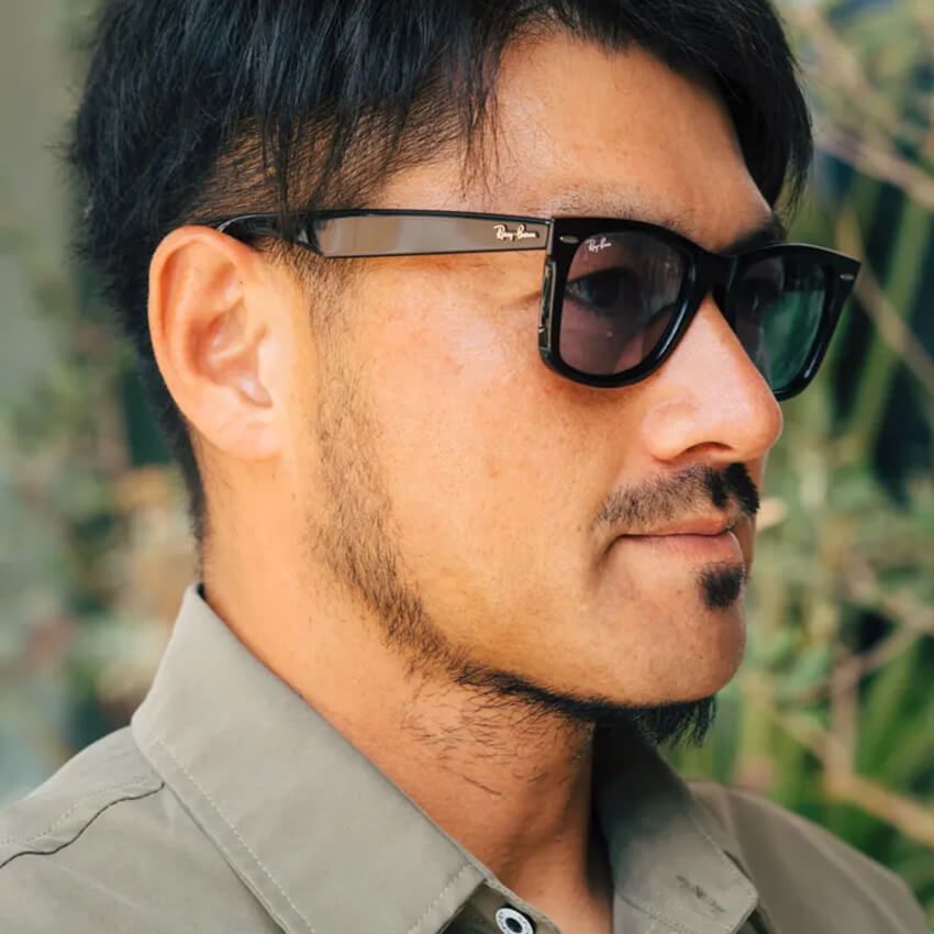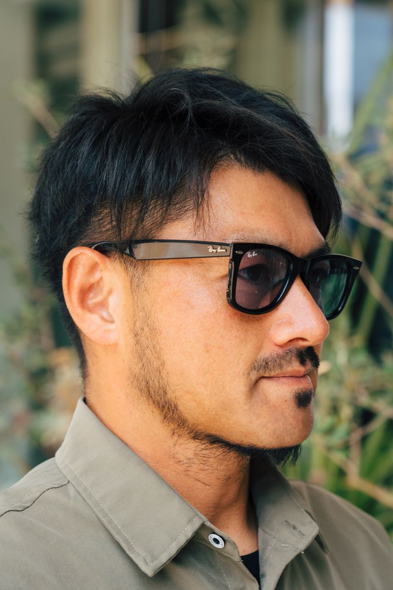 レイバンのウェイファーラーは街でも海でもサマになるから、マッチしないワケがない。一方で、スニーカーはオールブラックでどことなくシックな雰囲気も加えた。