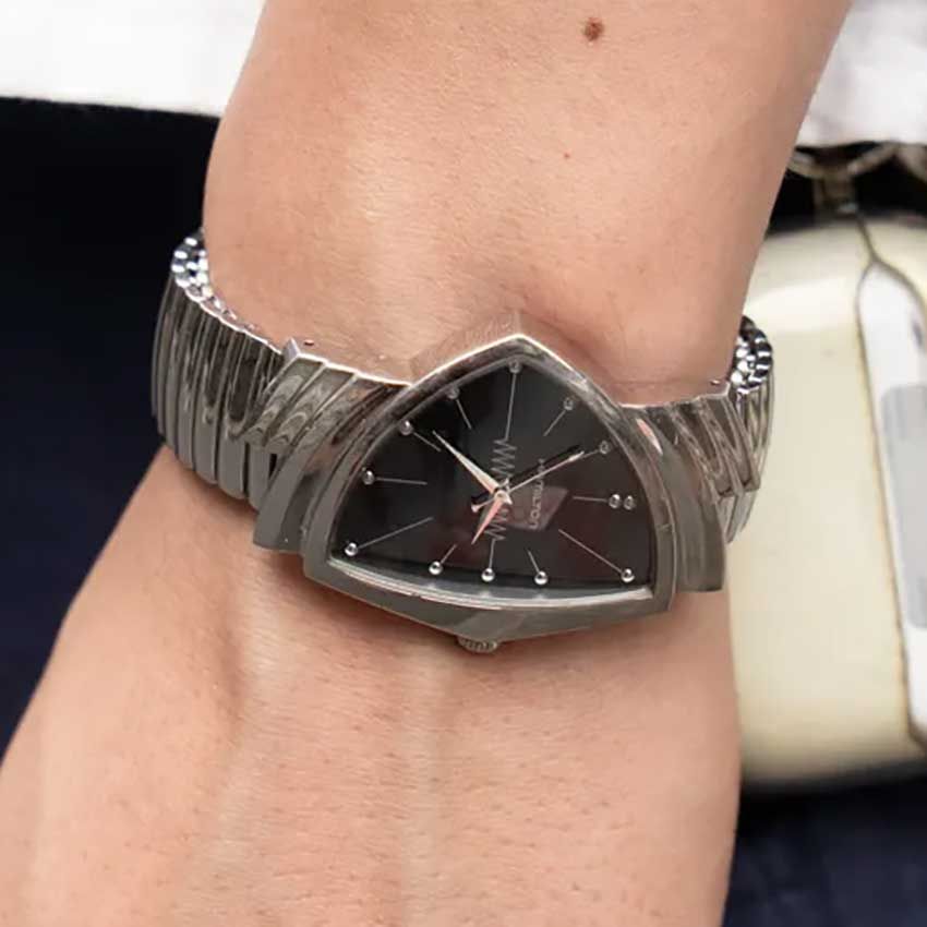 押しも押されもしない、世界初の電池式腕時計。かのエルヴィス・プレスリーが愛用するなど、箔の付き方もファンマインドをくすぐる。そして、それらの予備知識がなくても三角形の盾型フォルムがココロに響く。ベンチュラ。やっぱ、素直に格好いい!