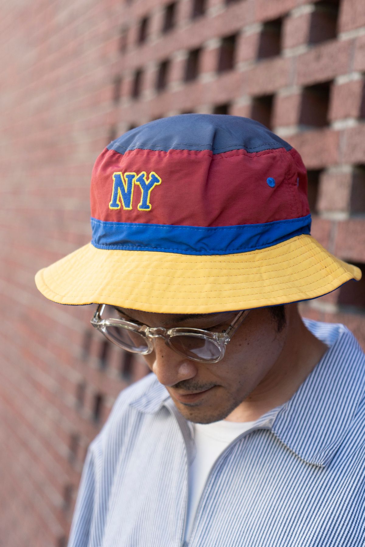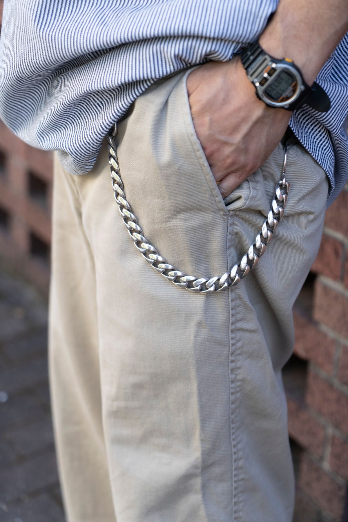 シャツ=ベンデイビス Tシャツ=ユナイテッドアローズ パンツ=ビッグマック シューズ=テバ 帽子=アンパイア 眼鏡=ビューティーアンドユースユナイテッドアローズ×金子眼鏡 靴下=コンビニエンスウェア×フジロックフェスティバル ピアス、リング、ウォレットチェーン=すべてクロムハーツ 腕時計=タイメックス