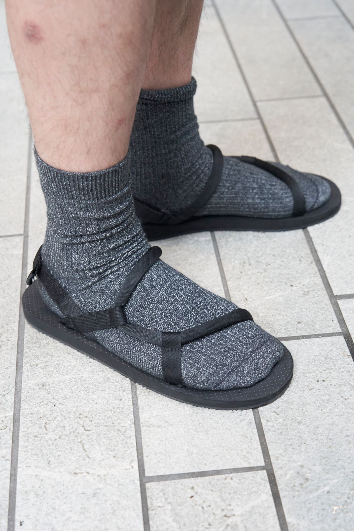 ▶ハヤトさんのスナップをすべて見るハヤトさん(26歳)同じく「ソックオンサンダル」を使用したコーディネイトをもう1例。ソックスの上からでも難なく履けて、ホールド感上々。その特徴を踏まえた、お手本的スタイルだ。
