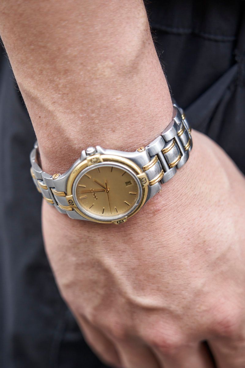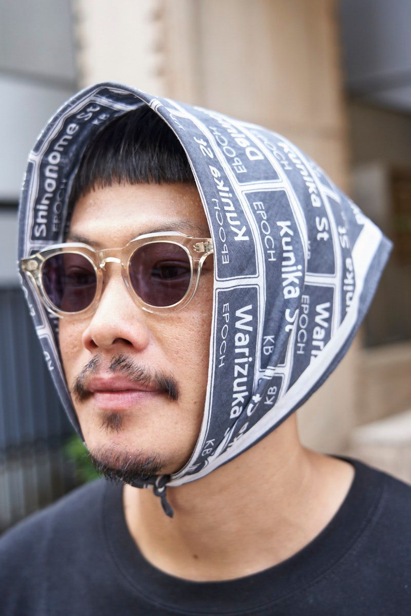 Tシャツ=ウェイク パンツ=シーシー シューズ=ニューバランス スカーフ=エポック×ミンナノ 眼鏡=ニュー 腕時計=グッチ