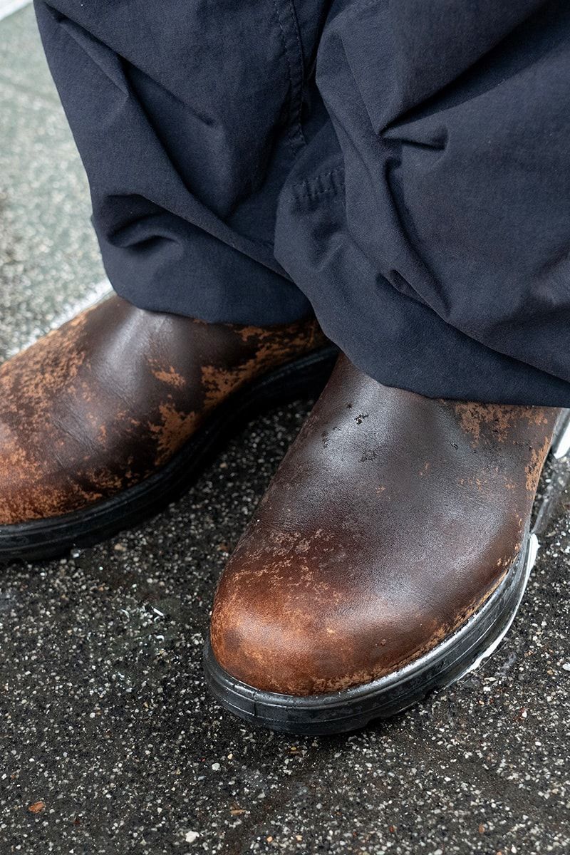 ▶︎田中さんのスナップをすべて見る田中英輔さん(50歳)大雨のなか撮影にご協力いただき、本当にありがとうございます!と感謝しきりだが、レインブーツ並みの防水性を誇る“サイドゴアブーツの祖”で足元を固め、トップスも多機能ベストを着用するなど、抜かりなし。