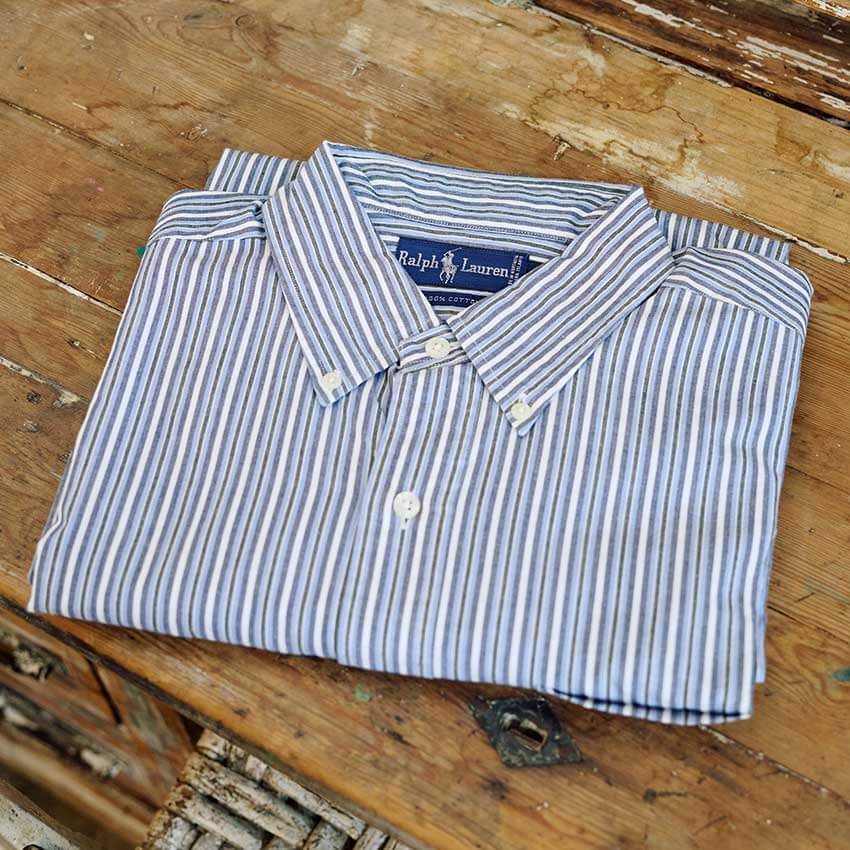 宮島 “ラルフ”のストライプBDシャツ、Lサイズ。BDシャツの襟ボタンを外して着るのが好きなんですよ。海外俳優のスタイルに影響されて。最初から馴染むのも古着ならではの魅力。