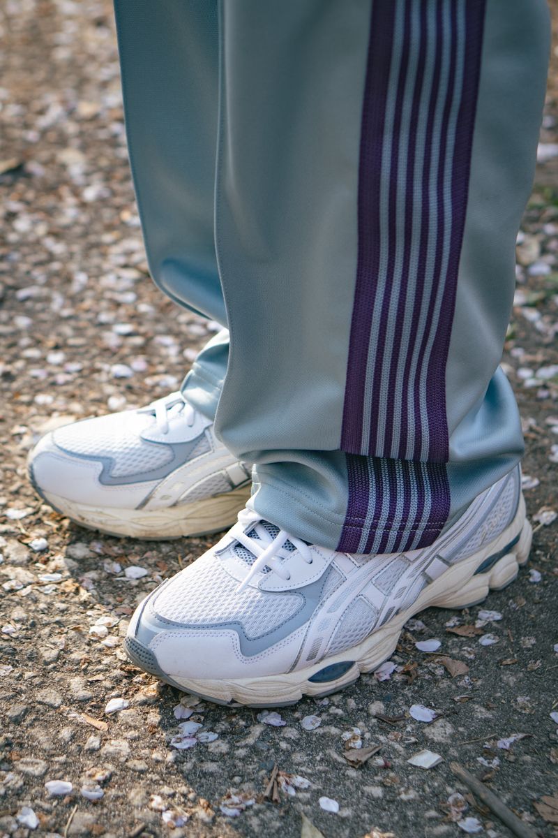 そのパープルがデニムジャケットのインディゴと調和し、パンツ本体のグレーカラーは白いスニーカーとのマッチングが抜群。ラフなトップスレイヤー含め、ぜひ今秋のご参考に。