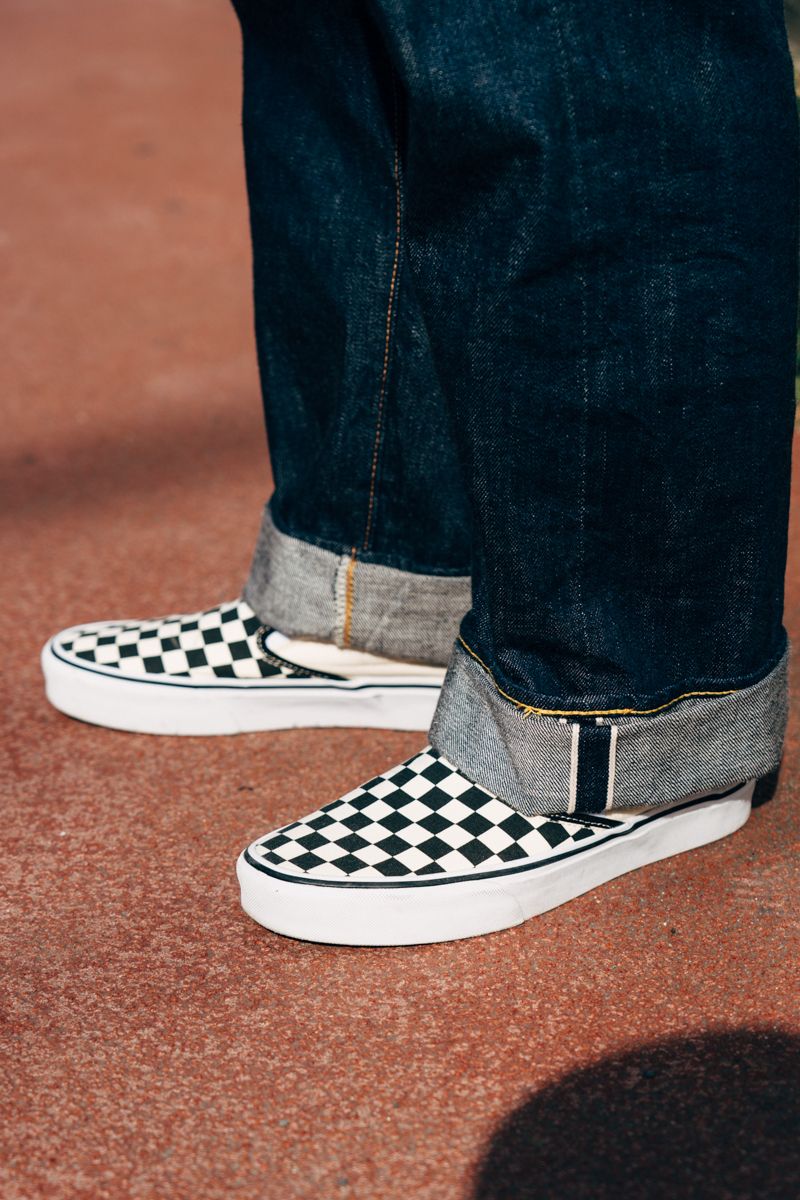 締めは、チェッカーフラッグ柄の「スリッポン」で脱ブナン。映画『初体験/リッジモンド・ハイ』でかの名優が履いたアイコンは、安心感と遊び心を同時に物語るかのよう。
