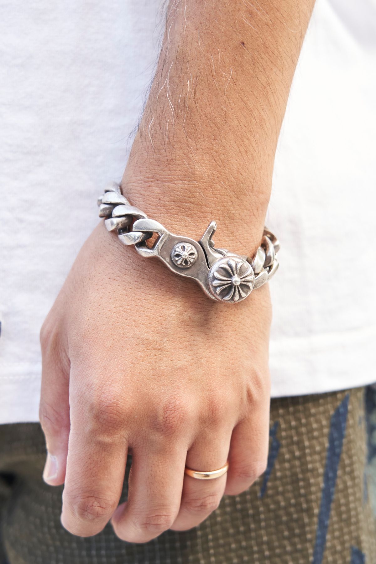 ▶︎荒井さんのスナップをすべて見る荒井真彦さん(43歳)ダイレクトなメッセージを添えるTシャツに、ピースフルなカモ柄パンツを添える。シンプルでも声高らかに審美眼を主張する、確信犯的ミニマルスタイルである。