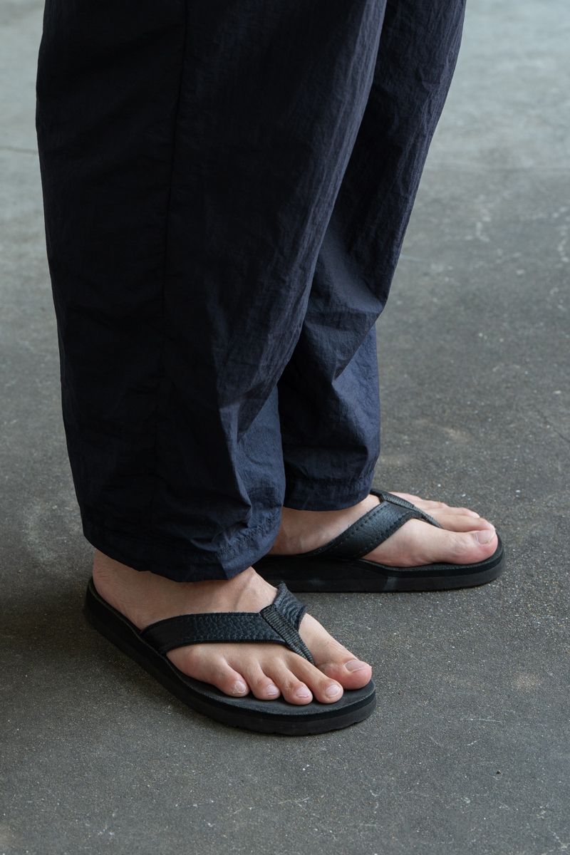 廃れない高感度シンプルな装いを締め括るのは、オールハンドメイドの黒いビーサン。軽やかな構造にレザーのシボ感を携え、大人の“重み”も感じさせてくれる。