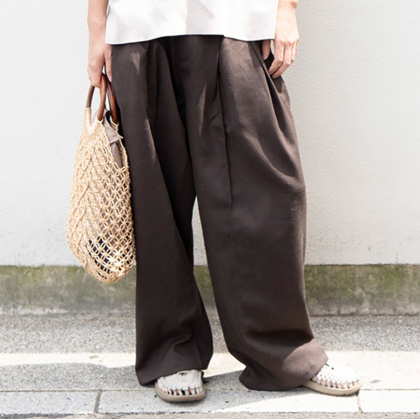 楽なうえに、シックなブラウンなら全身のクリーンな印象は保てる。小牧さんは編みのバッグでもリラックス感や気取らない雰囲気を強調している点も巧い。