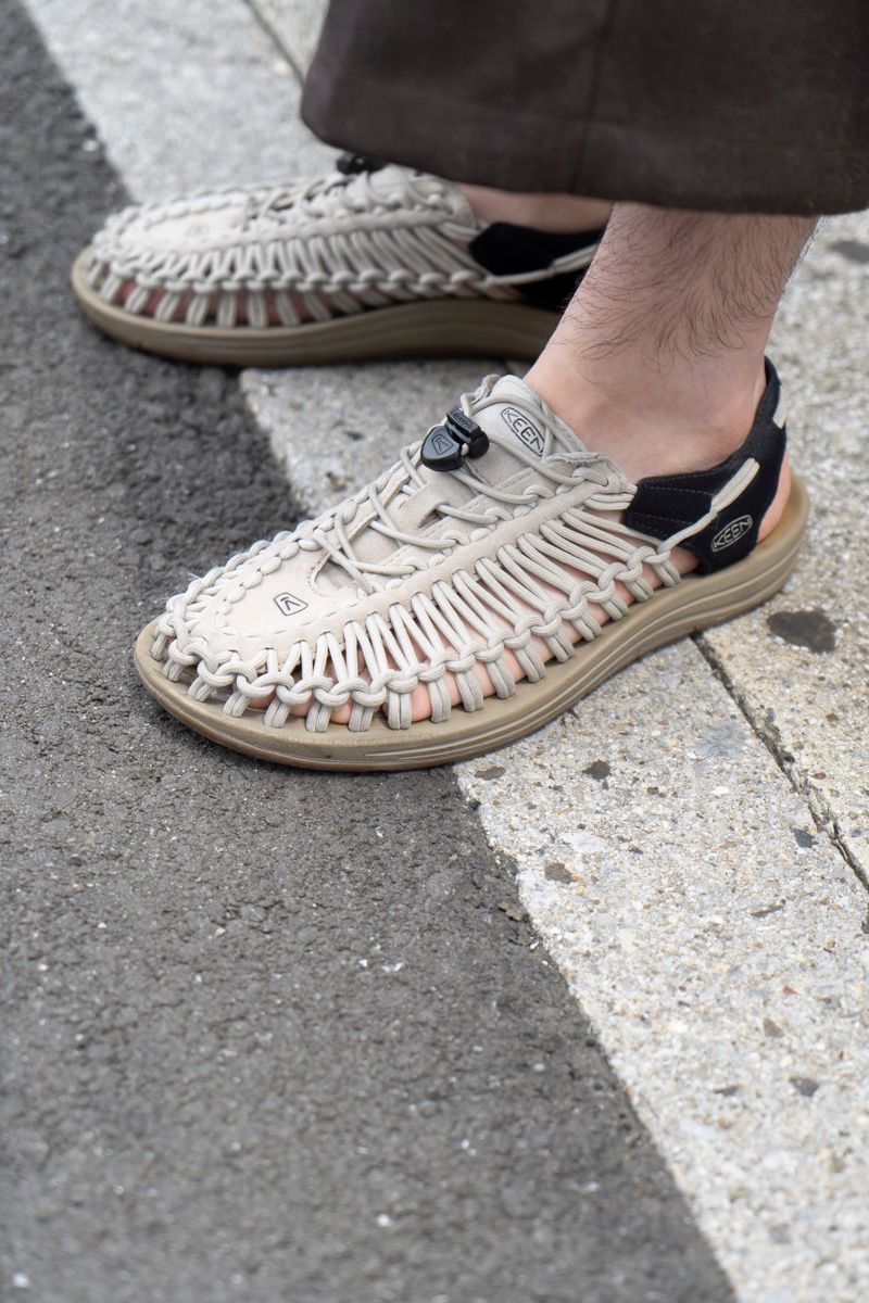 透け感のあるバッグも夏らしくていい!と思ったら、キーンの「ユニーク」も同様の効果が。素足で気持ちいいって、最高だ。