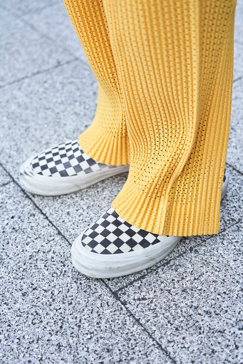 ▶︎ヤスオさんのスナップをすべて見るヤスオさん (34歳)淡色というにはあまりにも強烈な、インパクト抜群のイエローセットアップ。とはいえ柔らかな生地感と美しいドレープが手伝って、単なる派手とは無縁の仕上がりに。