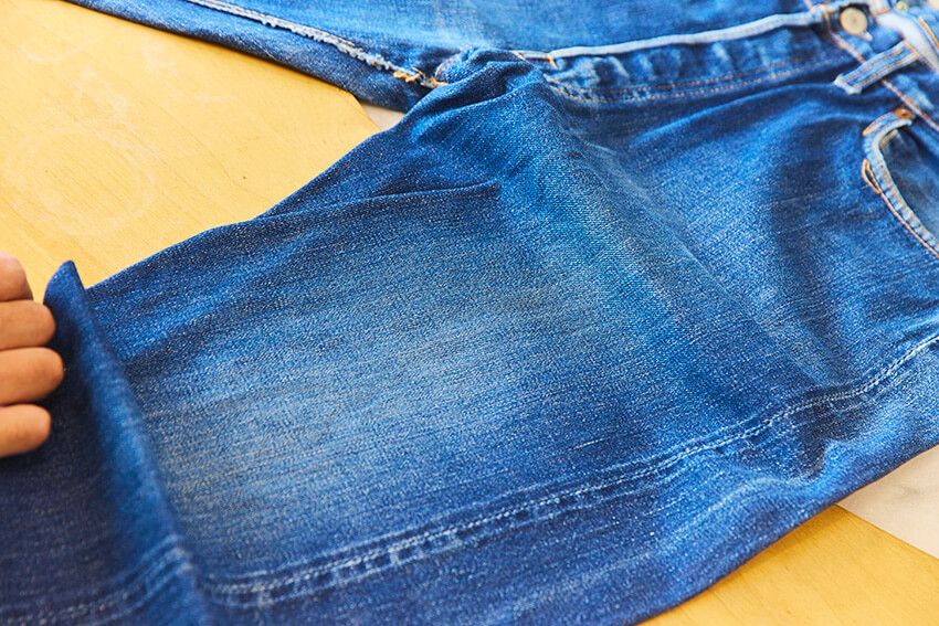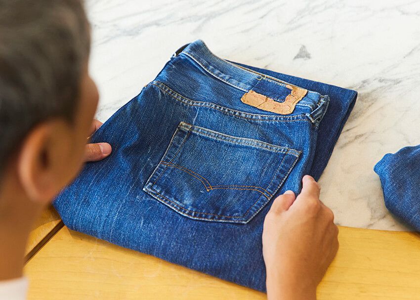 「丈がすごく短く、裾を折り返してはいていました。当時はお金がなくて迷いましたが、色が良かったので思い切って購入しました。今では妻がよくはいています」。