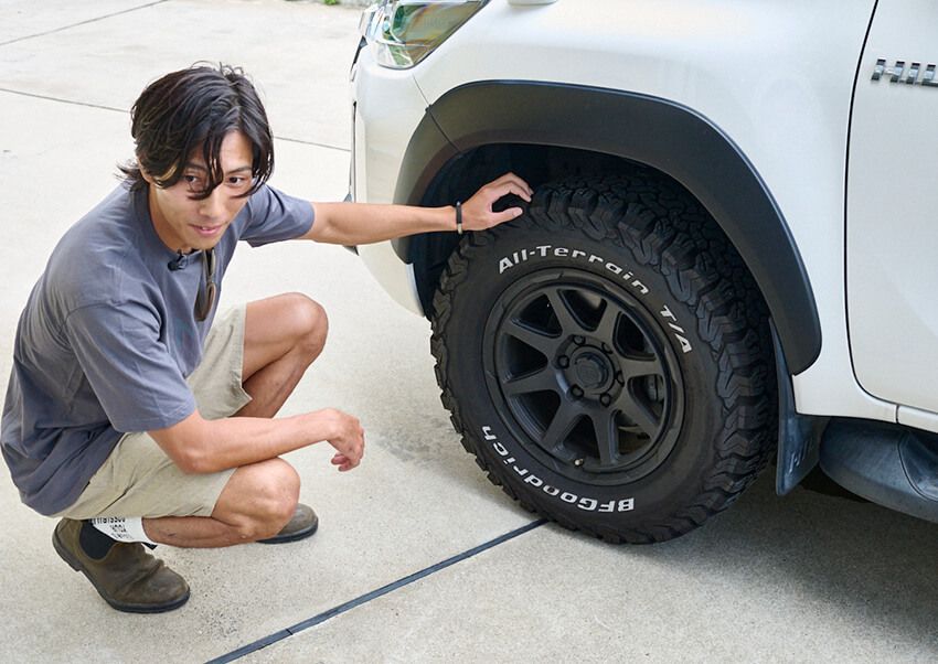 「タイヤはゴツゴツ感のある『BFグッドリッチ』のものにしました。この王道のフォントも格好いいですよね。純正のタイヤより車高が数センチ上がっています。3センチを超えると構造変更の手続きをしなきゃいけないので、規定の範囲内でカスタムしながら、自分の理想に近づけてる感じです。