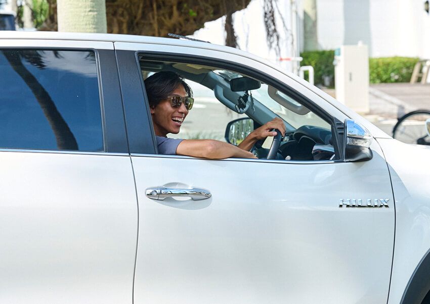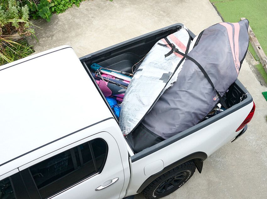 海と生きる人たちが放つ特有のグッドバイブス。プロウィンドサーファーの白方優吏さんも例外ではなく、眩しいほどさわやかな笑顔で現れた。愛車であるトヨタ「ハイラックス」の白いボディも、気のせいか一段と輝いて見える。