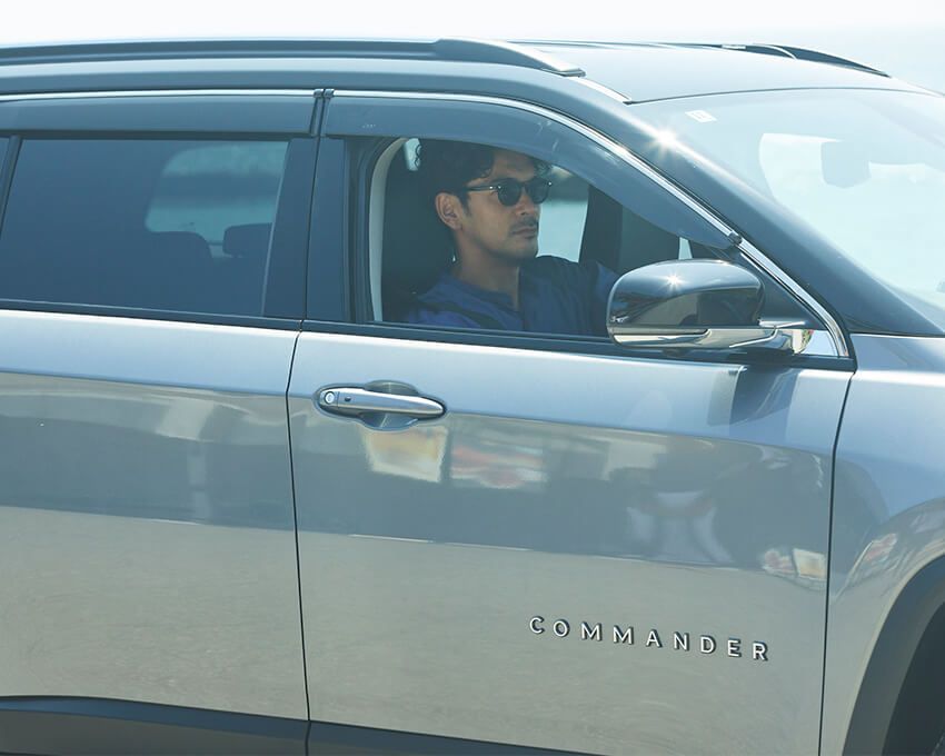 「今日のような海だったり、キャンプ場だったり、子どもが喜ぶフィールドの玄関口って、ある程度ラフな道になることがありますよね。ミニバンだと少々気を遣ってしまうけれど、コマンダーなら走りの面で、凸凹道でも、まったく不安はなし。外出への安心感がフットワークを軽くしてくれそう」と、JEEPらしさを大いに実感。