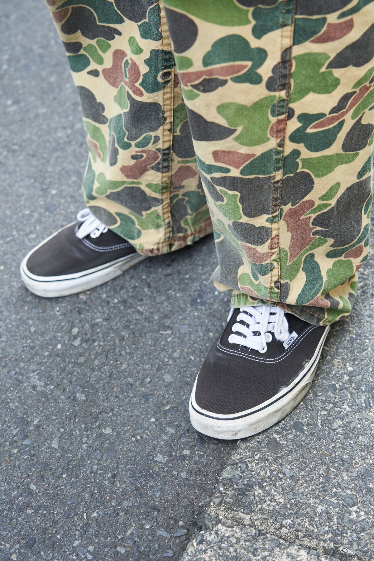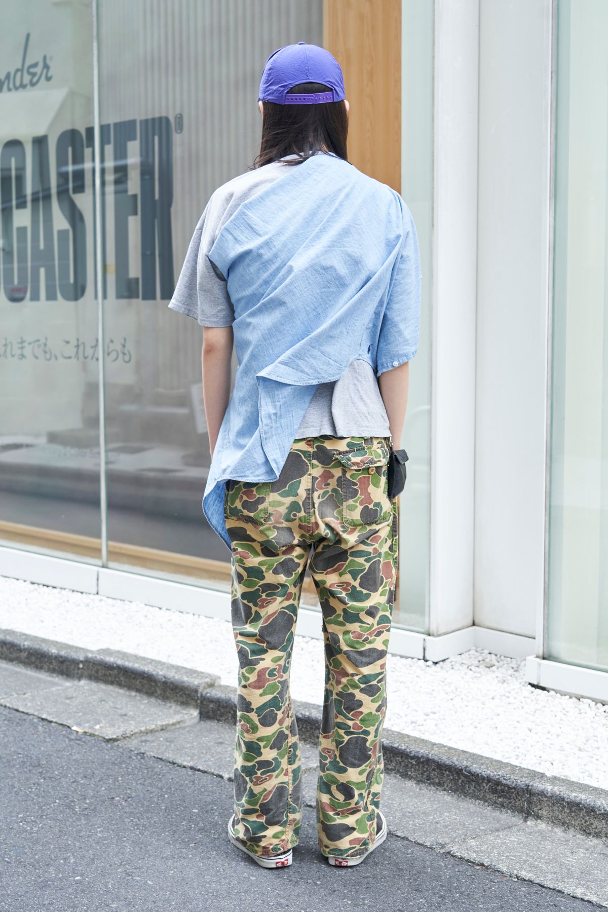 ▶︎カミムラさんのスナップをすべて見るカミムラさん(22歳)ダックハンターカモのフレアシルエット。インパクトのある個性派パンツに負けじと、ビッグサイズの薄手シャツをだらりと掛ける。この大胆さが気持ちいい。