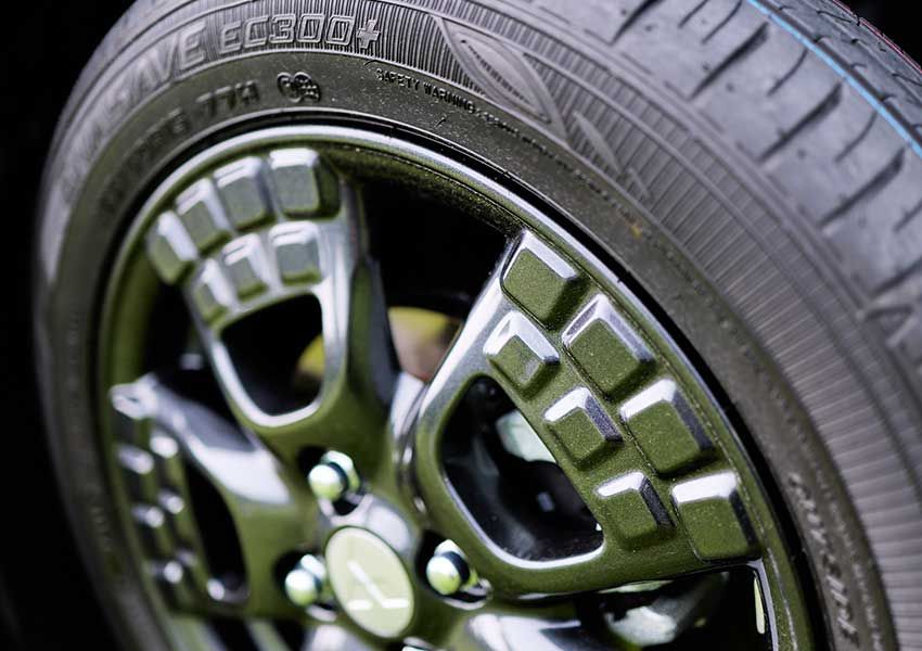 ホイールには、アウトドアギアを彷彿とさせる意匠が施されていて、トレッキングシューズの靴底をモチーフにしたデザイン。軽自動車でありながら、アクティブな足元をしっかりと表現しています。
