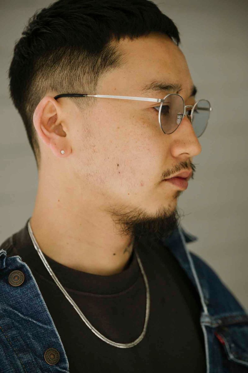 デニム=ムシンサスタンダード スニーカー=ニューバランス バッグ=古着 サングラス=レイバン 腕時計=サムスン