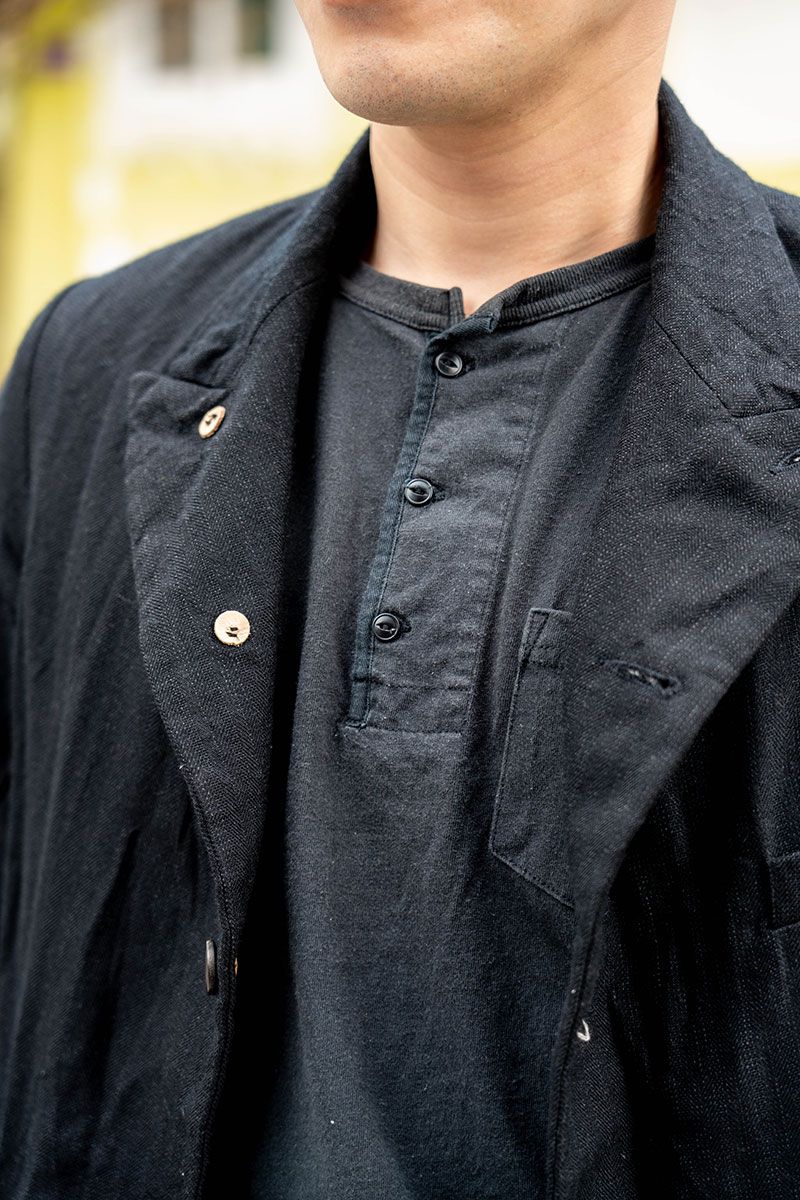 インナーにはヴィンテージのヘンリーネックを仕込んで足元はドレッシーな革靴で締めるなど、バランス感覚も独特にして新鮮。参りました!
