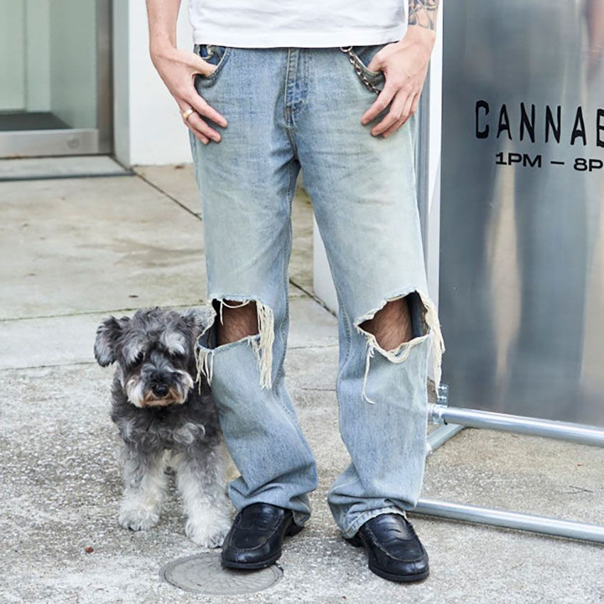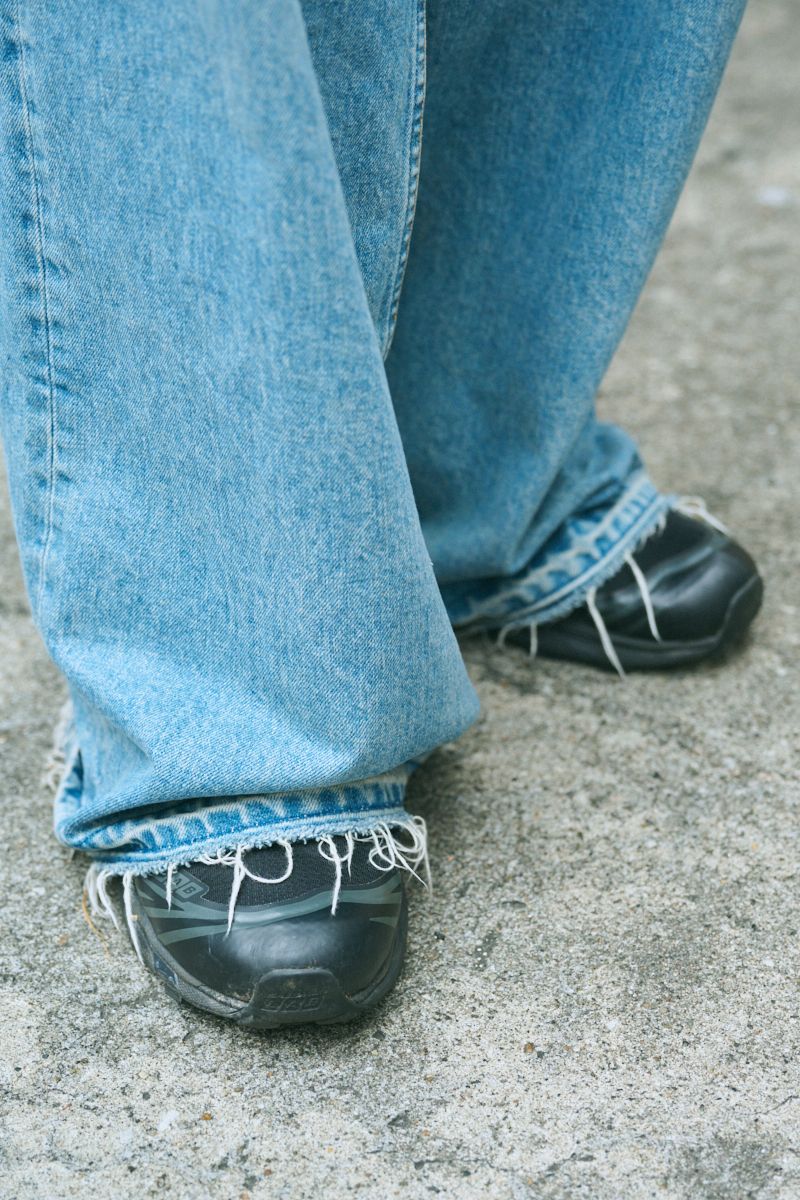 ▶︎松橋さんのスナップをすべて見る松橋敬祐さん (28歳)Tシャツから覗かせた勲章の剥がれ後が、目を引くワイドシルエット。注目の若手、エムエーエスユーが手がけるデニムには、ダボッとクッションした裾や、そのランダムにほつれた糸など、フレッシュな感性が息づく。