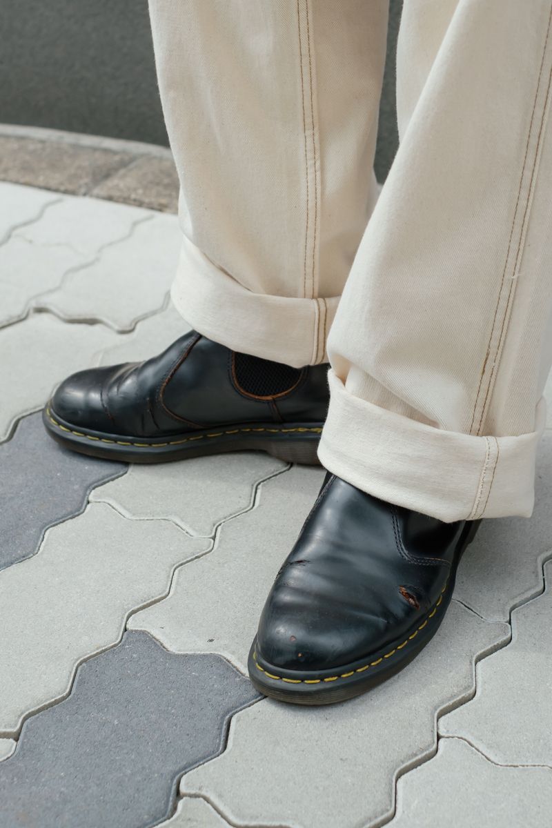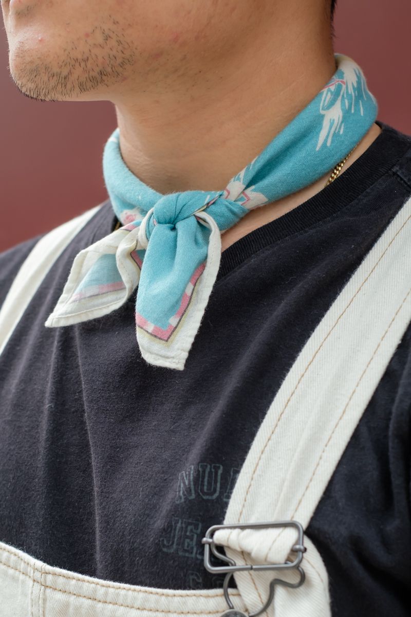 ▶︎服部さんのスナップをすべて見る服部詞恩さん (28歳)白のオーバーオールを主役に、モノトーンを基調とした装い。ハット、メガネ、バンダナが三位一体となり、顔まわりを個性的に彩っている。さらに、ベージュ、水色、ブラック、ホワイトが交わるカラーパレットが、彼の優しい表情を引き出している。