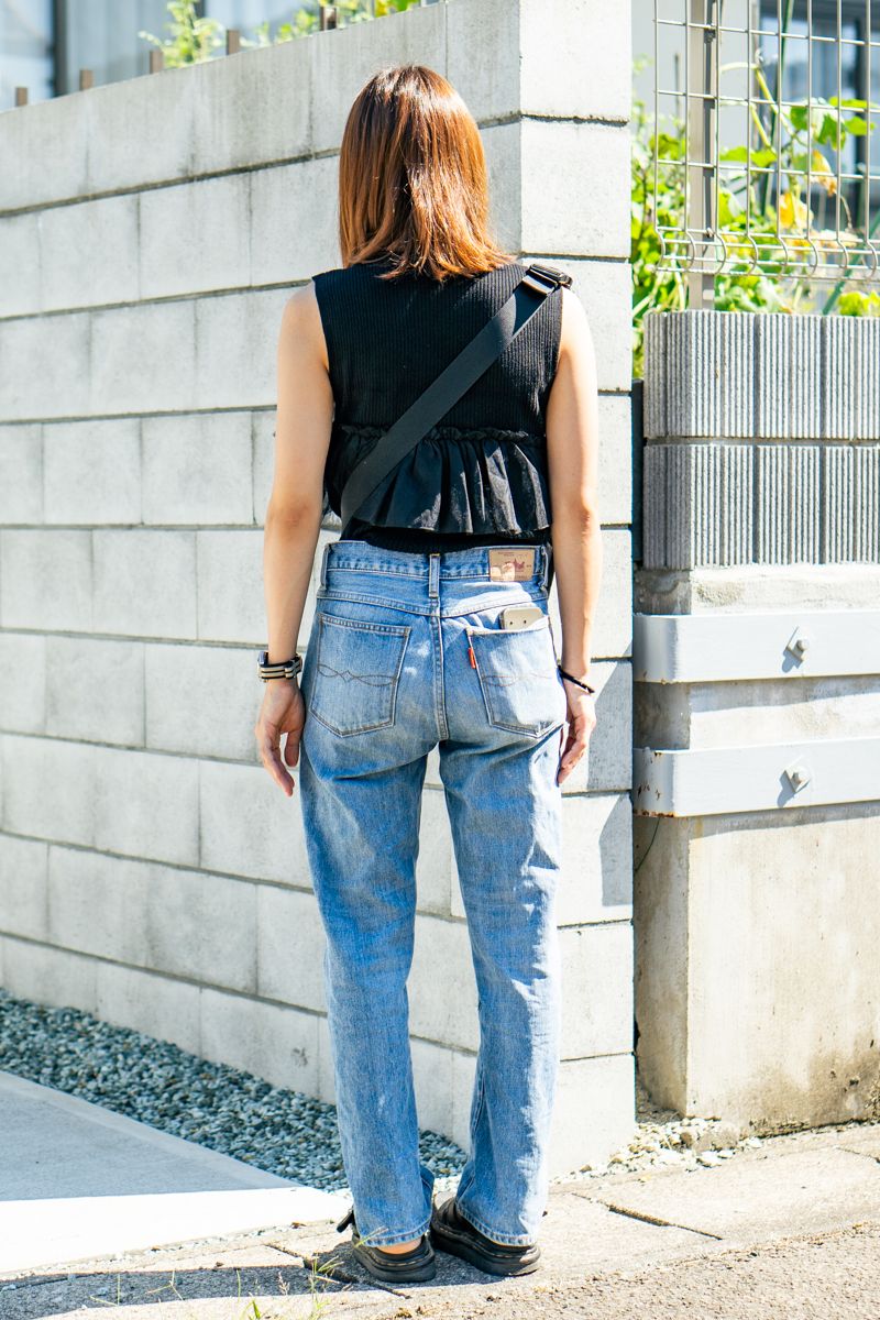 ▶︎中田さんのスナップをすべて見る中田さんラストは女性のデニムスタイルをパパラッチ。黒のフリルトップスが放つフェミニンな存在感を、ライトブルーデニムが程良くカジュアルダウン。